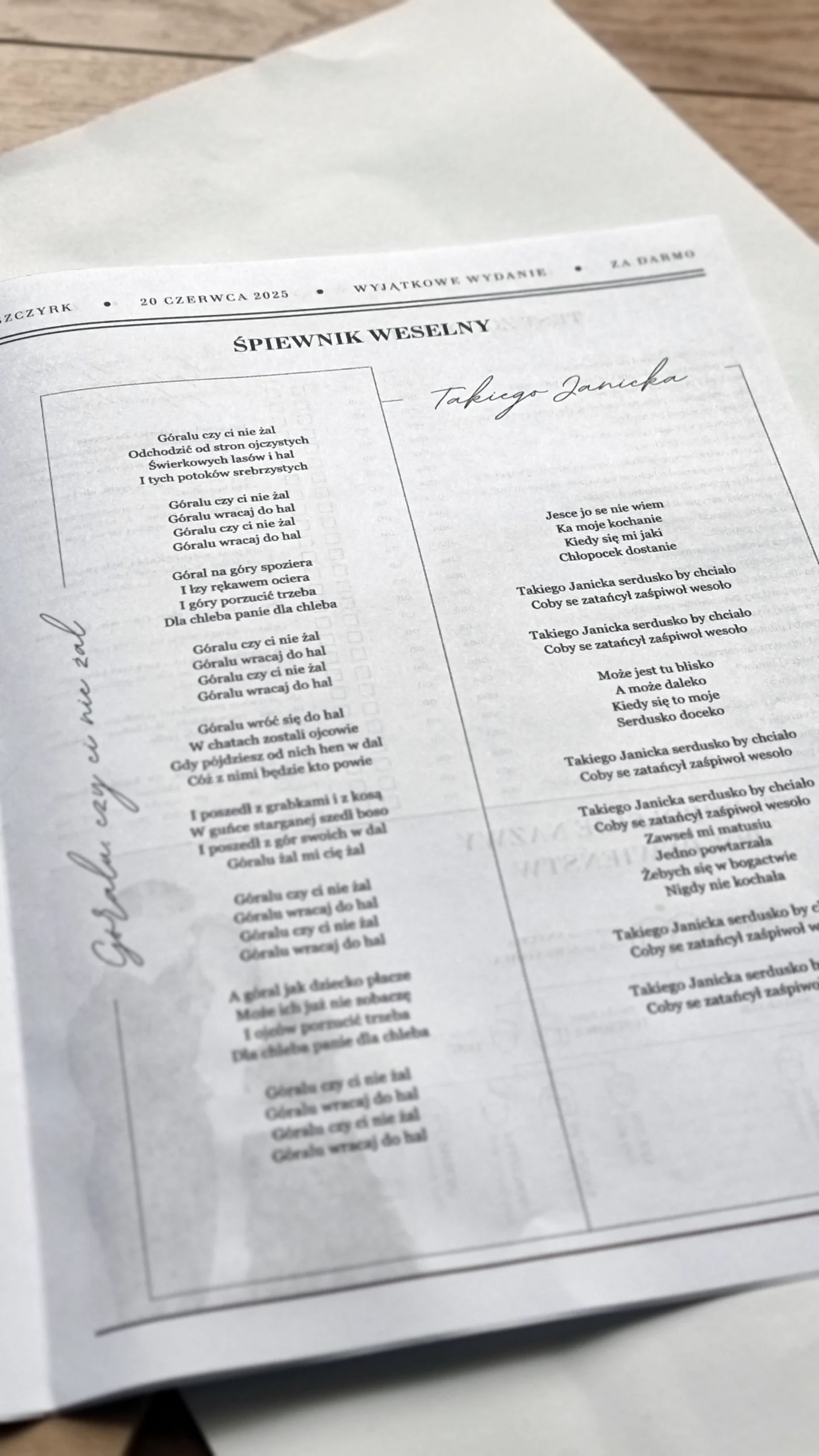 Śpiewnik to nieodłączny element Gazety Weselnej, który zapewnia gościom rozrywkę i uczestnictwo w wydarzeniu. W tej sekcji można umieścić teksty popularnych piosenek weselnych, które będą wykonywane podczas uroczystości. Dobrze jest również uwzględnić utwory, które są znane i lubiane przez większość zaproszonych gości, aby stworzyć atmosferę radości i wspólnego śpiewania. Dodanie śpiewnika do Gazety Weselnej ułatwia gościom śledzenie tekstów piosenek podczas zabawy, co sprawia, że całe wydarzenie staje się jeszcze bardziej interaktywne i pełne radości.