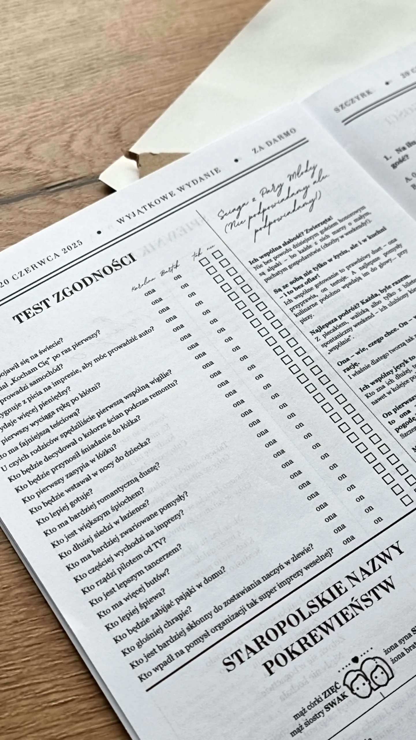 Gazeta to coś, co nie tylko informuje, ale także angażuje emocjonalnie. Może zawierać zabawne anegdoty, quizy o Waszej historii czy krzyżówki, które będą źródłem radości i śmiechu. Dzięki temu Wasze wesele stanie się jeszcze bardziej niezapomniane.