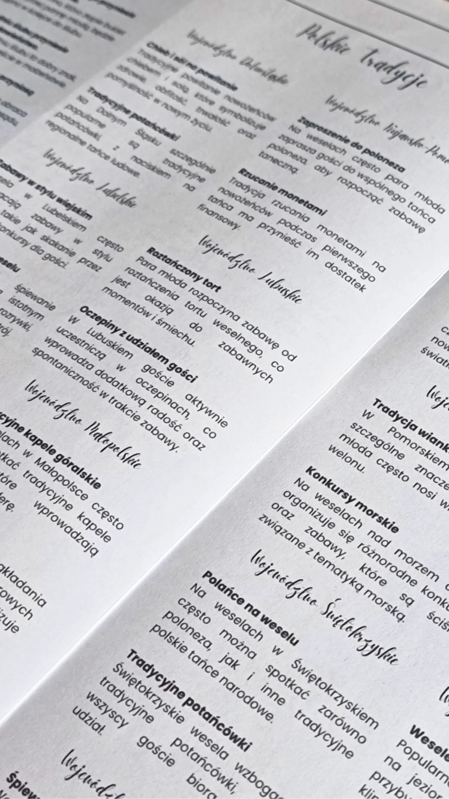 To także bardzo praktyczny element – zawrzeć w niej możecie harmonogram wydarzeń, mapę dojazdu, listę gości czy podziękowania. Dzięki temu goście będą czuli się swobodnie, a organizacja dnia stanie się prostsza.
