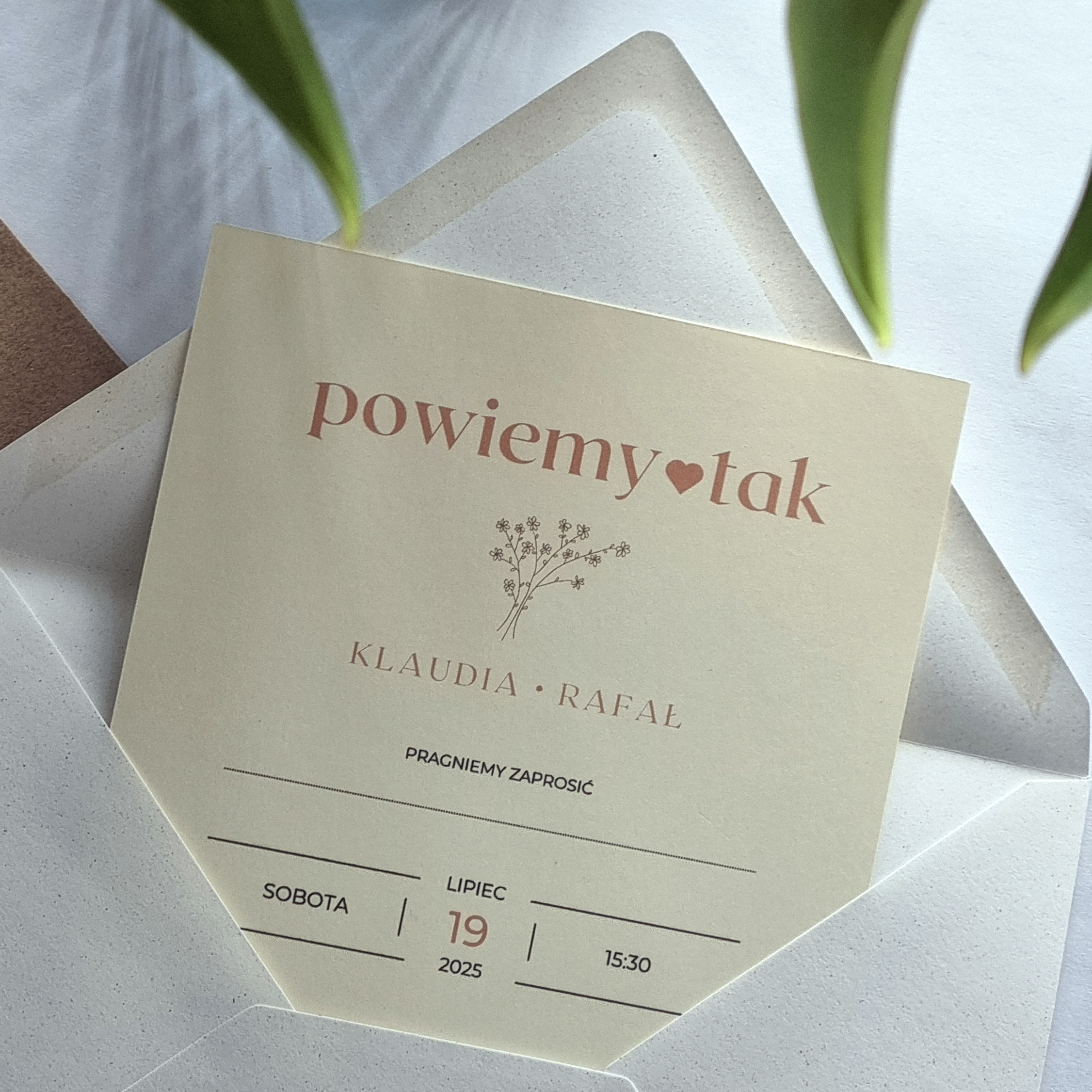 To zaproszenia, które przyciągają uwagę swoją prostotą i elegancją, a jednocześnie niosą ze sobą symboliczne przesłanie. Dzięki nim goście od pierwszego kontaktu z papeterią poczują atmosferę uroczystości – spokojnej, rodzinnej, pełnej harmonii i bliskości z naturą.