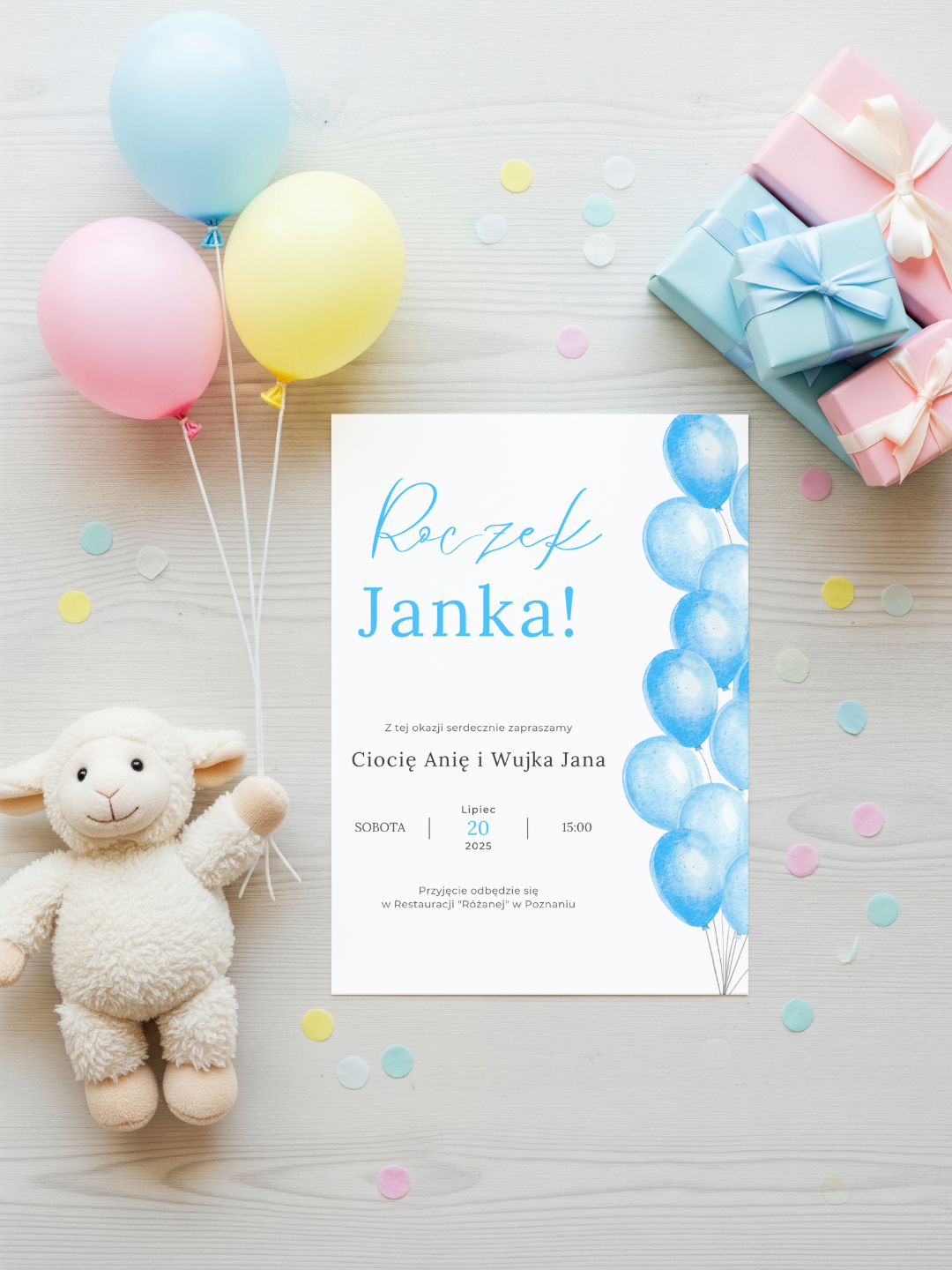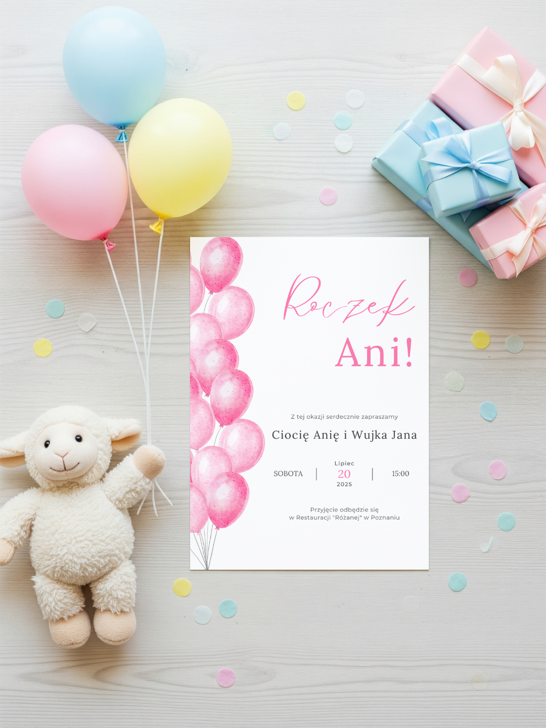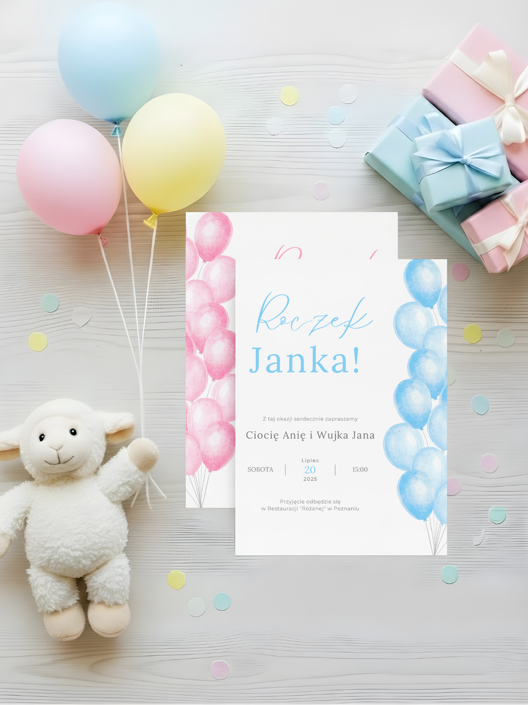 Wybierając zaproszenie Balonowy Lot, wybierasz styl, który jest radosny, nowoczesny i pełen pozytywnej energii. To idealny projekt dla osób, którzy chcą, by ich przyjęcie wyróżniało się świeżością i kolorami.