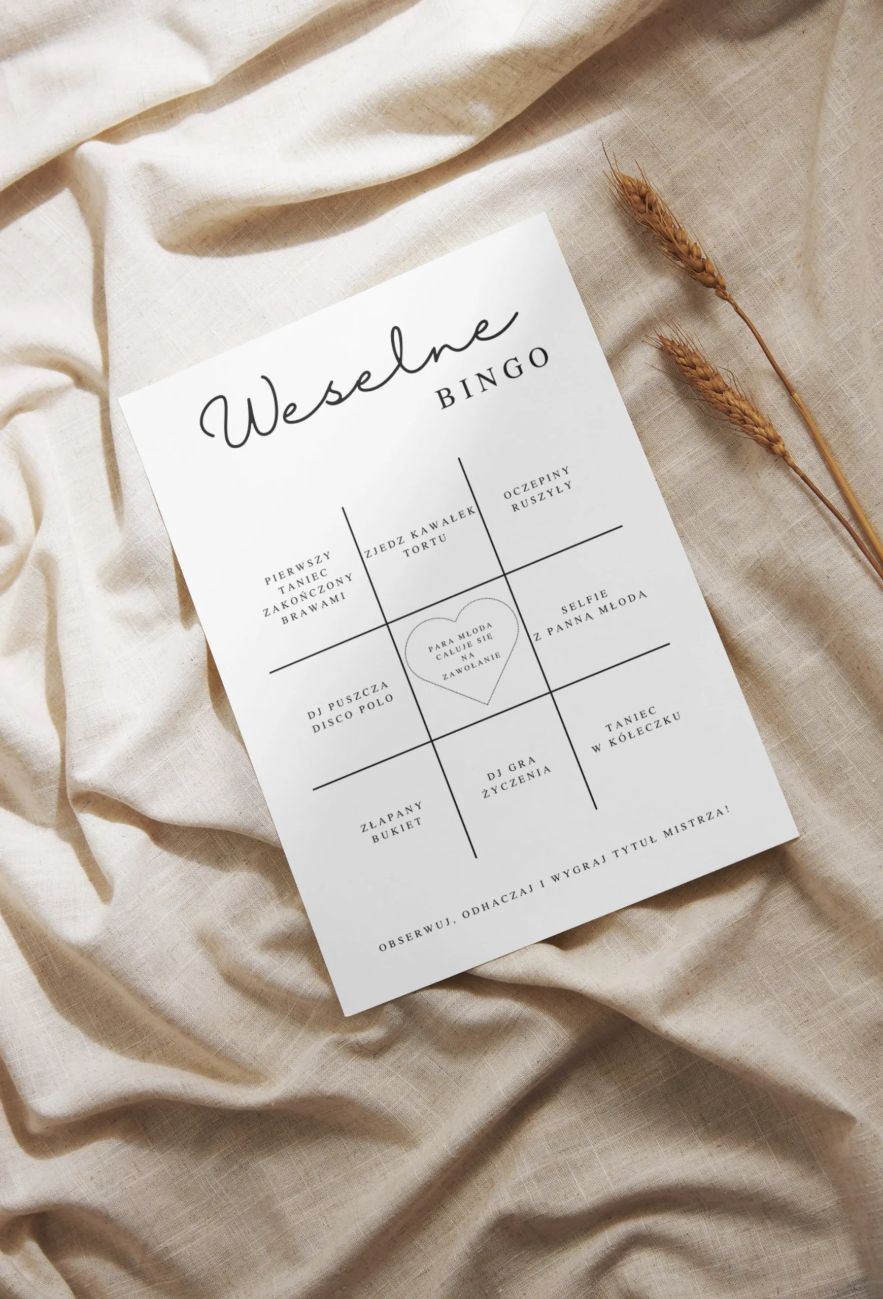 Bingo weselne to interaktywna gra obserwacyjna. Zamiast tradycyjnych liczb, na kartach znajdują się radosne i charakterystyczne wydarzenia, które niemal na pewno wydarzą się podczas Waszego przyjęcia. Zadaniem gości jest baczne obserwowanie otoczenia i odhaczanie pól w momencie, gdy dane wydarzenie ma miejsce.