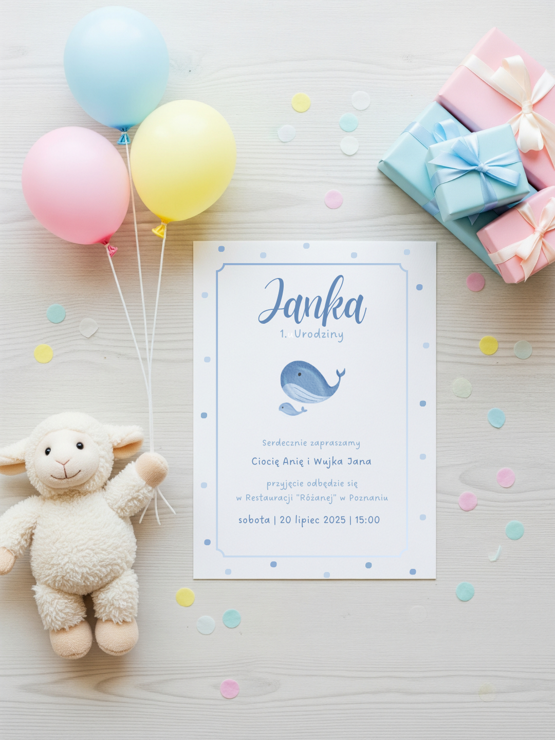 Zanurz się w Radości Pierwszego Roku! Roczek to moment, w którym Wasz maluch, niczym mały wieloryb, wyrusza w swoją pierwszą wielką podróż życia. To święto, które zasługuje na oprawę równie świeżą, kojącą i pełną cudów, jak bezkresny ocean. Szukacie zaproszenia, które będzie delikatne, urocze i jednocześnie niezwykle spójne tematycznie?