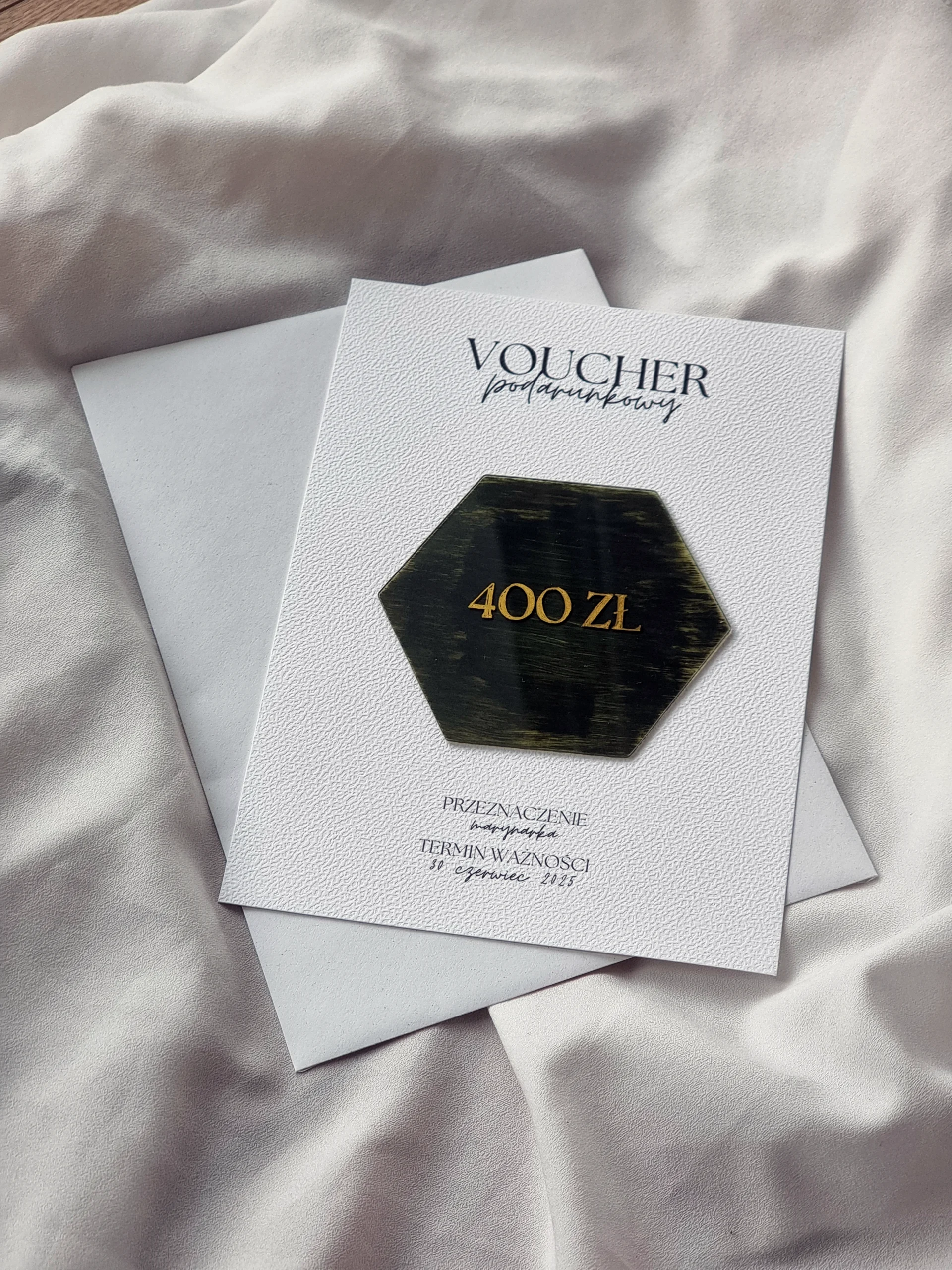 Voucher wyróżnia się eleganckim połączeniem białego, teksturowanego papieru z akrylowym elementem dekoracyjnym w kształcie geometrycznym (sześciokąt, jak na zdjęciu). W centralnej części akrylu widnieje wyraźny napis w kolorze złotym, który doskonale kontrastuje z ciemnym tłem. Detale te podkreślają nowoczesny, minimalistyczny charakter produktu, wpisujący się w aktualne trendy wzornictwa.
