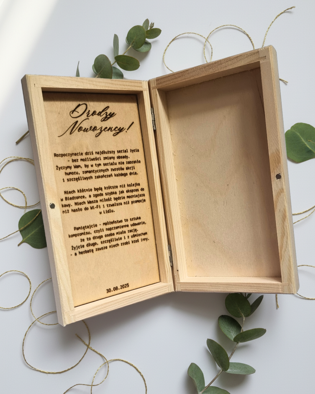 Każda “Skrzynka na Prezent” jest produktem w pełni ręcznie robionym, co gwarantuje jej unikalność i wysoką jakość. Nasze skrzynki wykonane są z trwałej sklejki, a precyzyjne wypalanie laserowe sprawia, że każdy detal jest wyraźny i estetyczny. Dzięki temu każda skrzynka staje się nie tylko opakowaniem, ale również małym dziełem sztuki, które można z dumą zaprezentować. Dbałość o szczegóły oraz jakość wykonania sprawiają, że “Skrzynka na Prezent” jest nie tylko piękna, ale również funkcjonalna.