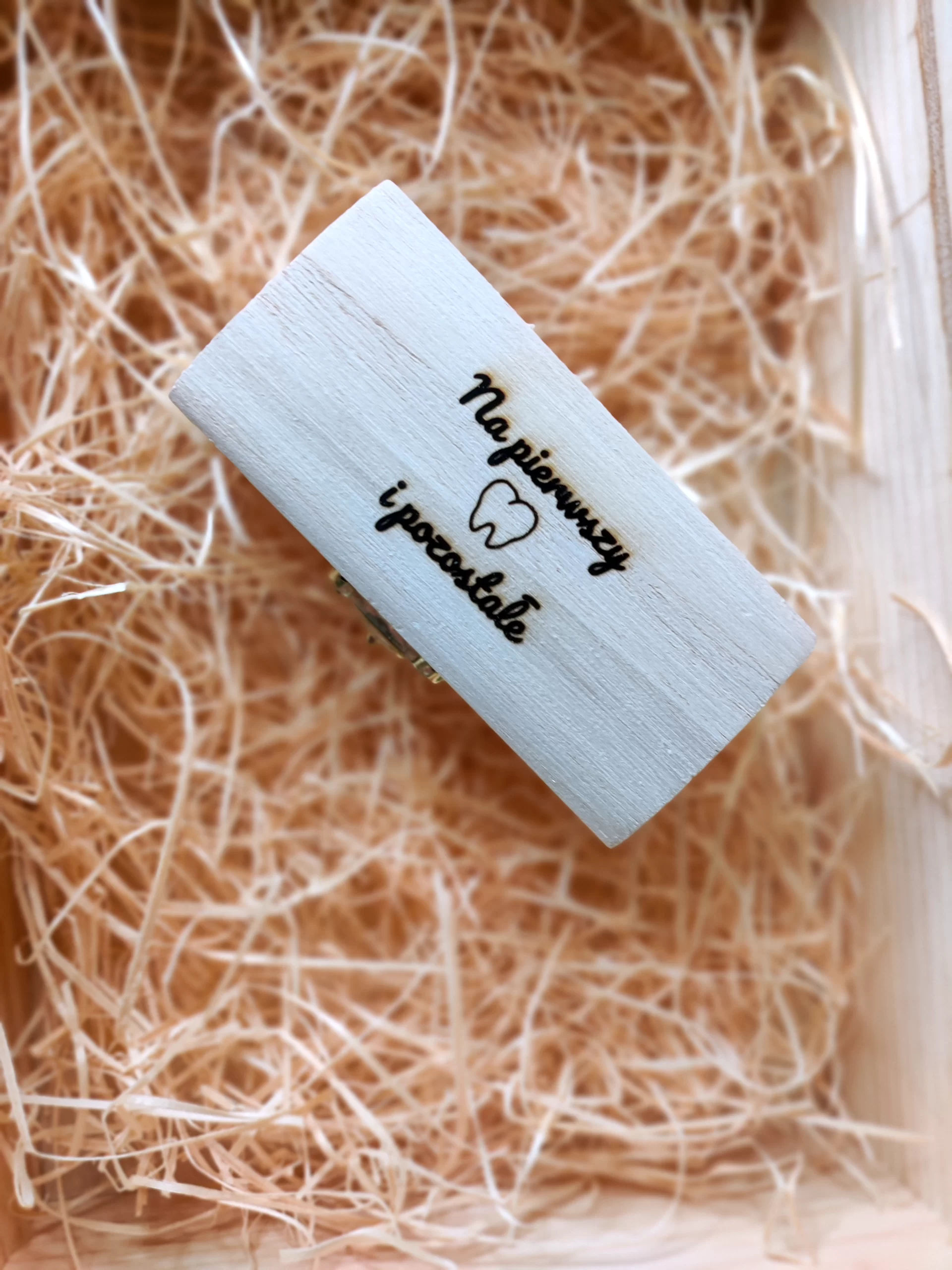 Jest to mały, uroczy dodatek, który służy do przechowywania pierwszego ząbka dziecka. Pierwszy ząbek to jedna z kluczowych pamiątek z dzieciństwa, którą rodzice często chcą zachować na długie lata. Dzięki specjalnie zaprojektowanemu pudełeczku, ten cenny skarb znajdzie swoje wyjątkowe miejsce w skrzynce, co dodatkowo wzbogaca całą pamiątkę. Pudełko na pierwszy ząbek to praktyczny i sentymentalny dodatek, który zachwyci zarówno rodziców, jak i w przyszłości samo dziecko.